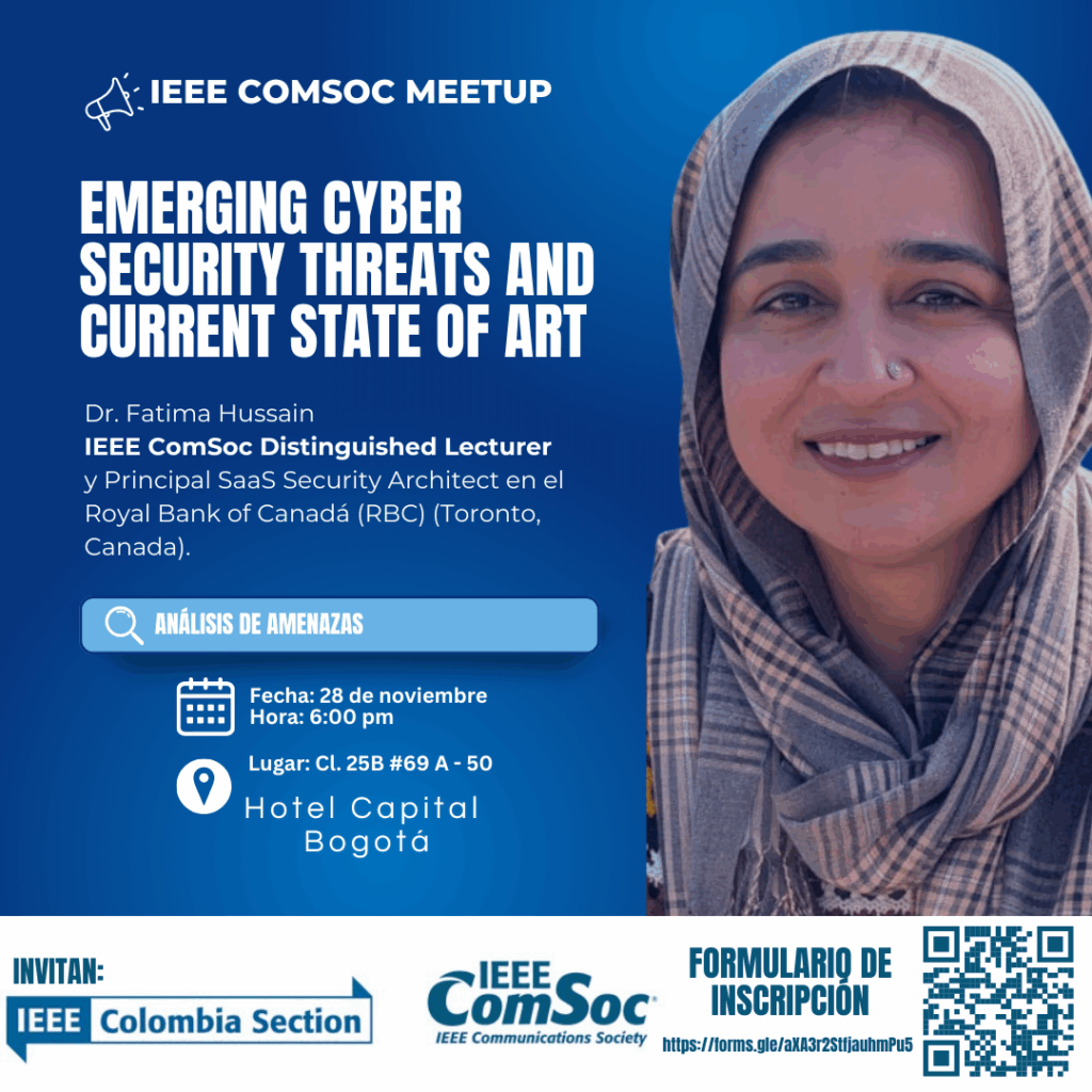 IEEE Colombia ComSoc Chapter and IEEE Colombia Section are glad to invite to the MeetUp “Emerging Cyber Security Threats and Current State of Art” featuring Dr Fatima Hussain (Royal Bank of Canadá), ComSoc Distinguished Lecturer.