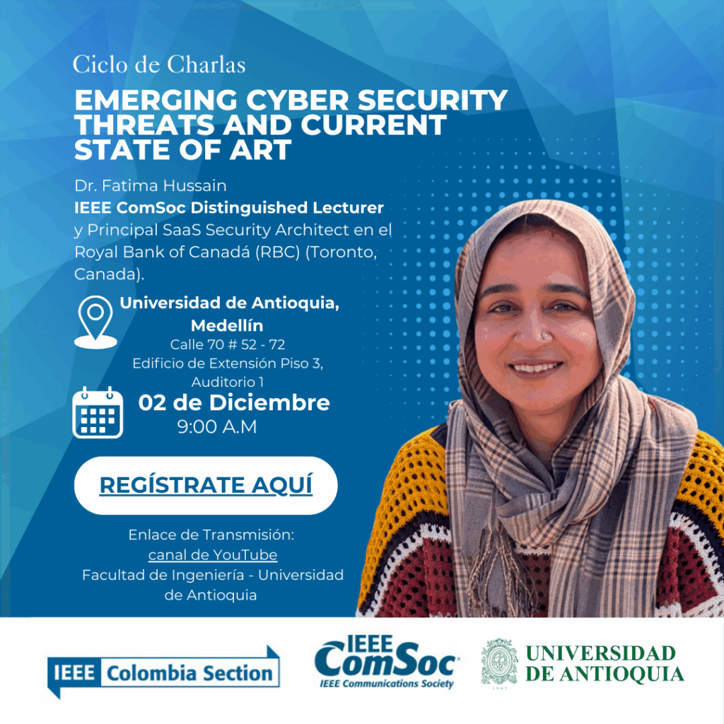 IEEE Colombia ComSoc Chapter, IEEE Colombia Section and Facultad de Ingeniería of Universidad de Antioquia are glad to invite to the conference “Emerging Cyber Security Threats and Current State of Art” presented by Dr Fatima Hussain (Royal Bank of Canadá), ComSoc Distinguished Lecturer.